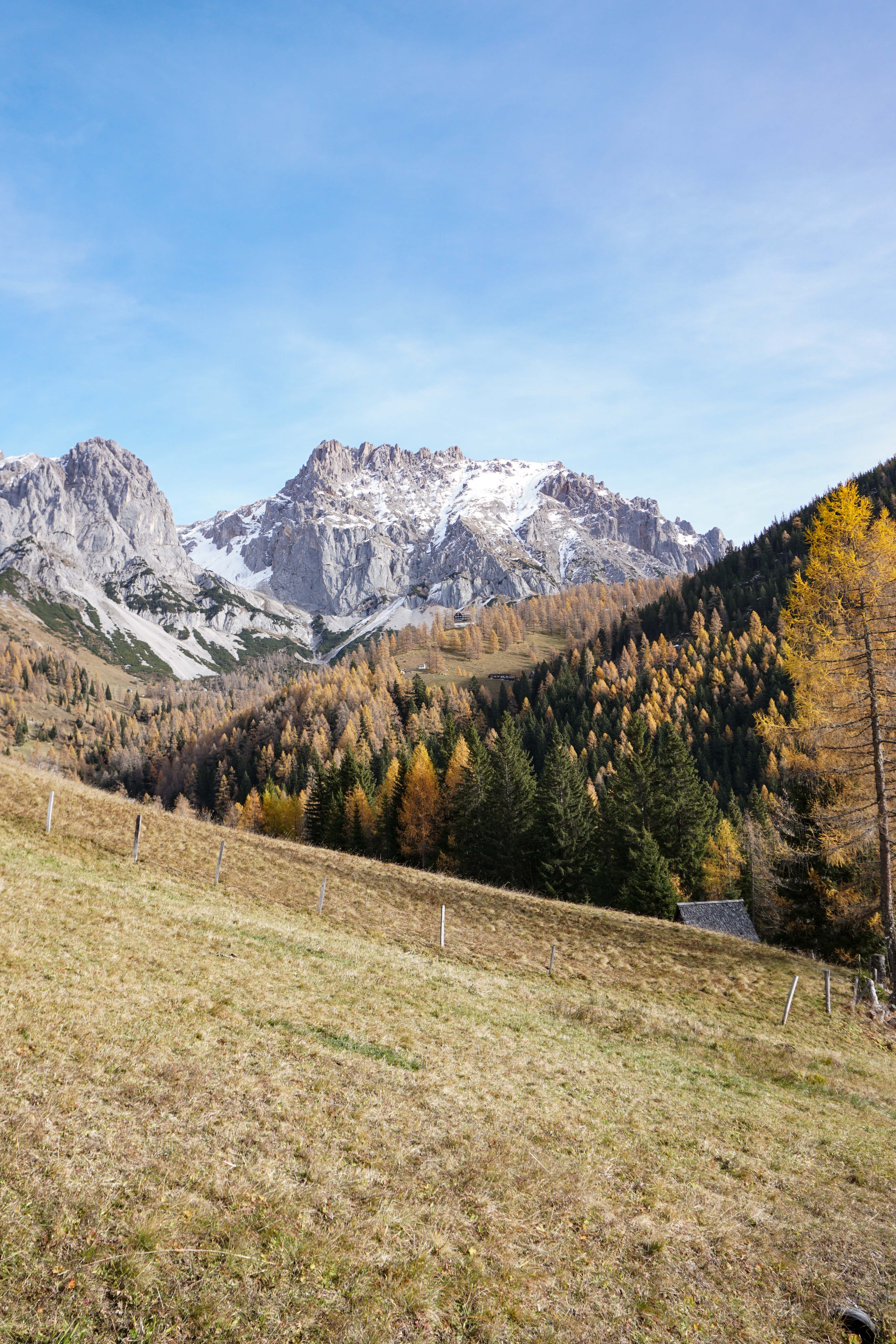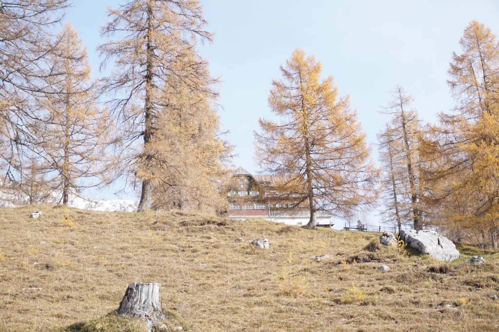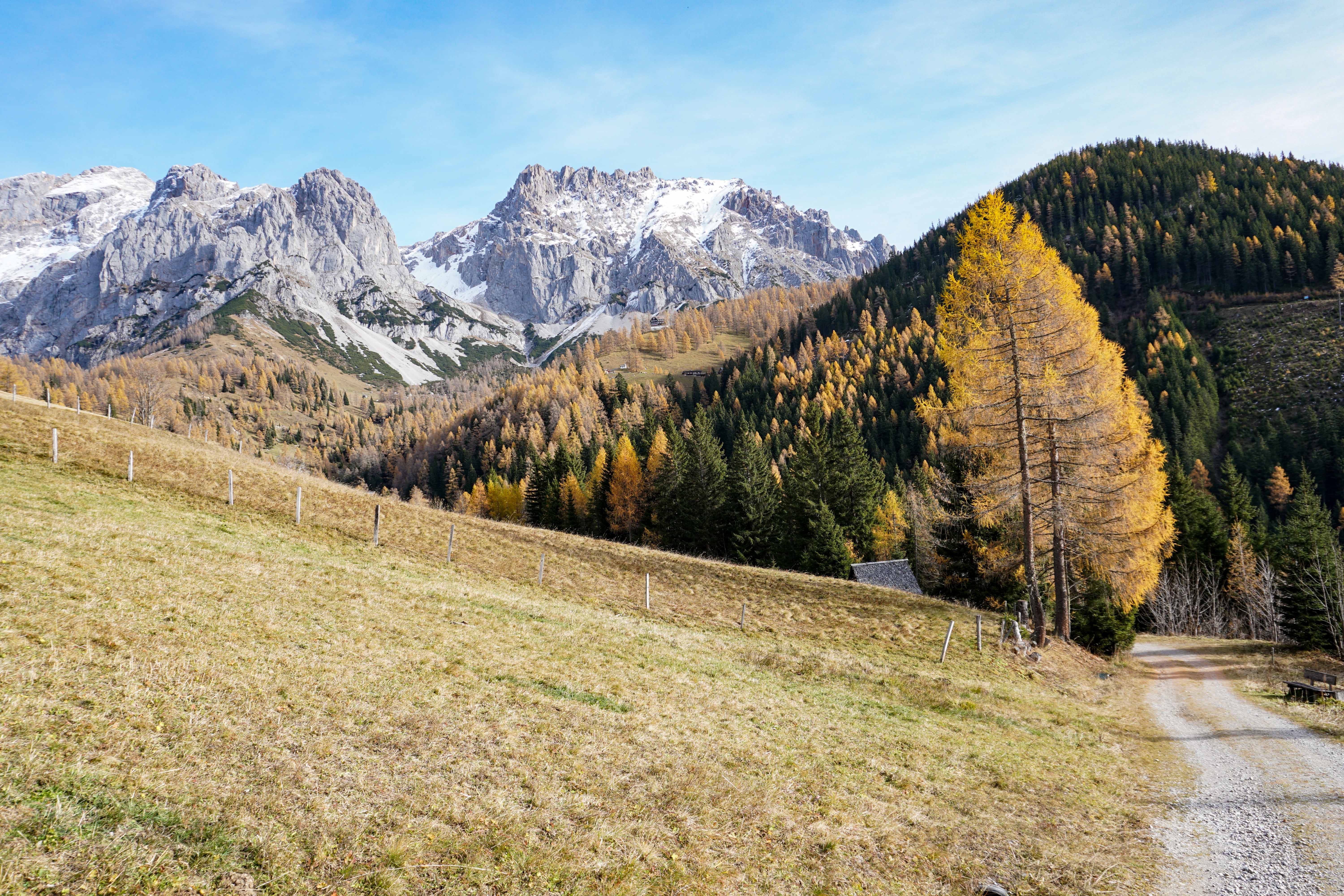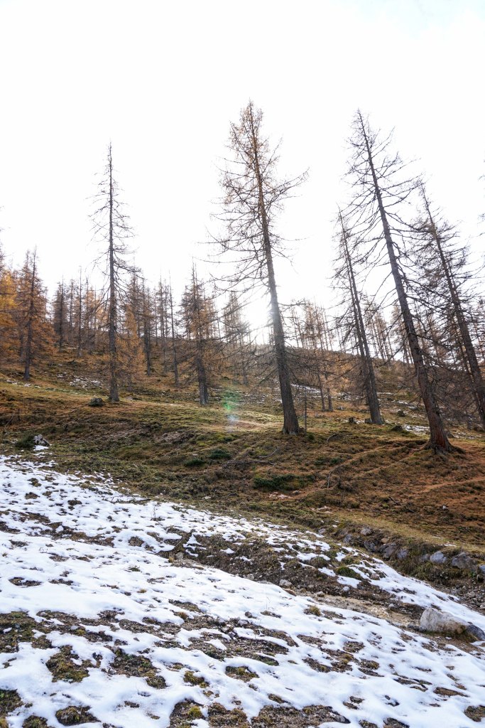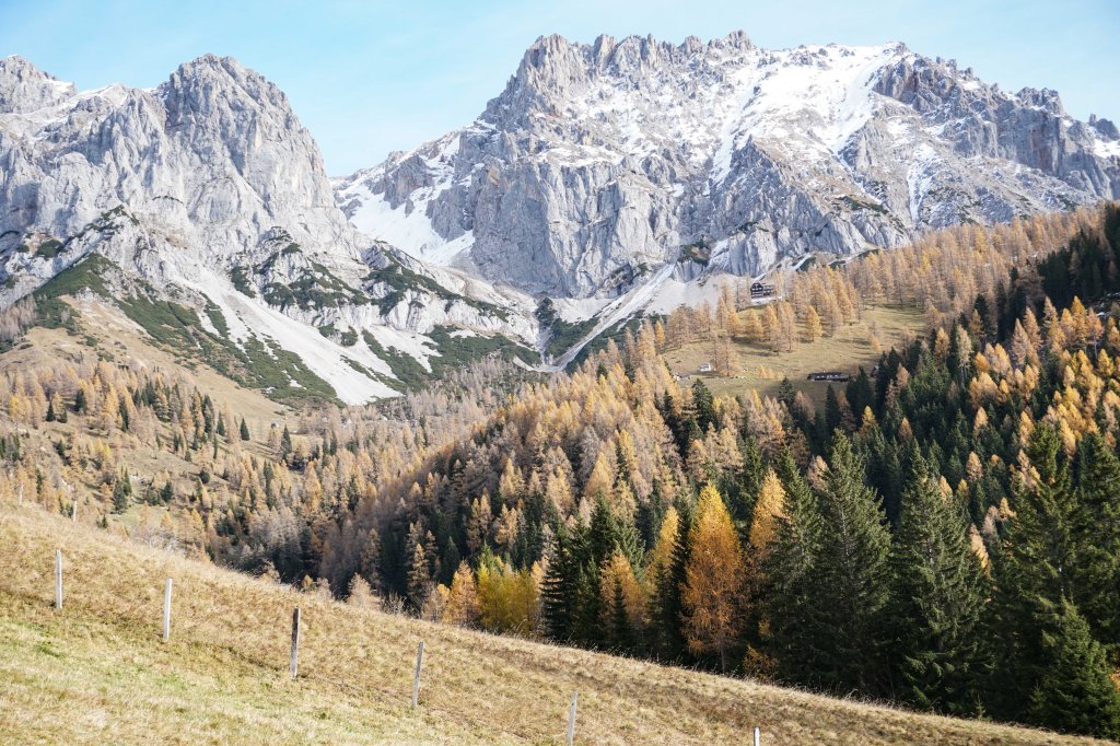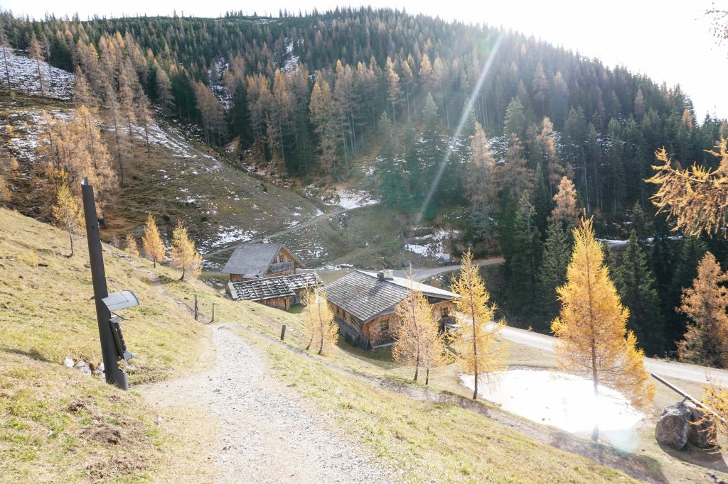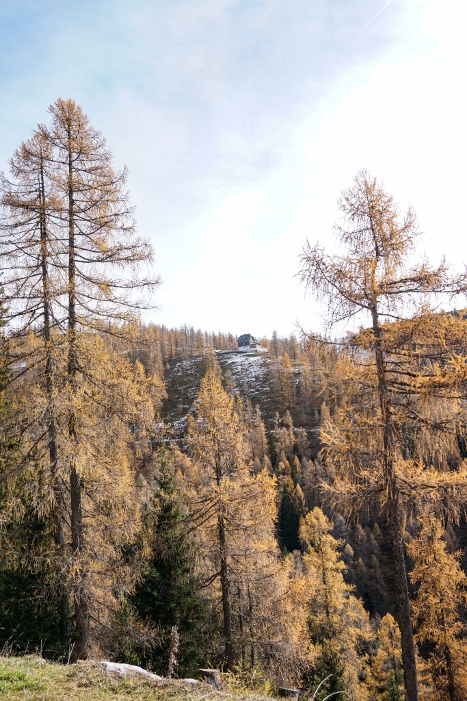 Nach dieser Sonnenpause geht’s über einen wunderschönen Almboden in Richtung Austriahütte. Die Lärchen erstrahlen in den prächtigsten Gelbtönen und wenn man unter jenen Bäumen steht, die bereits ihre Nadeln verloren haben, dann fühlt sich dass an, als ob man auf einem weichen Teppich danhingehen würde.