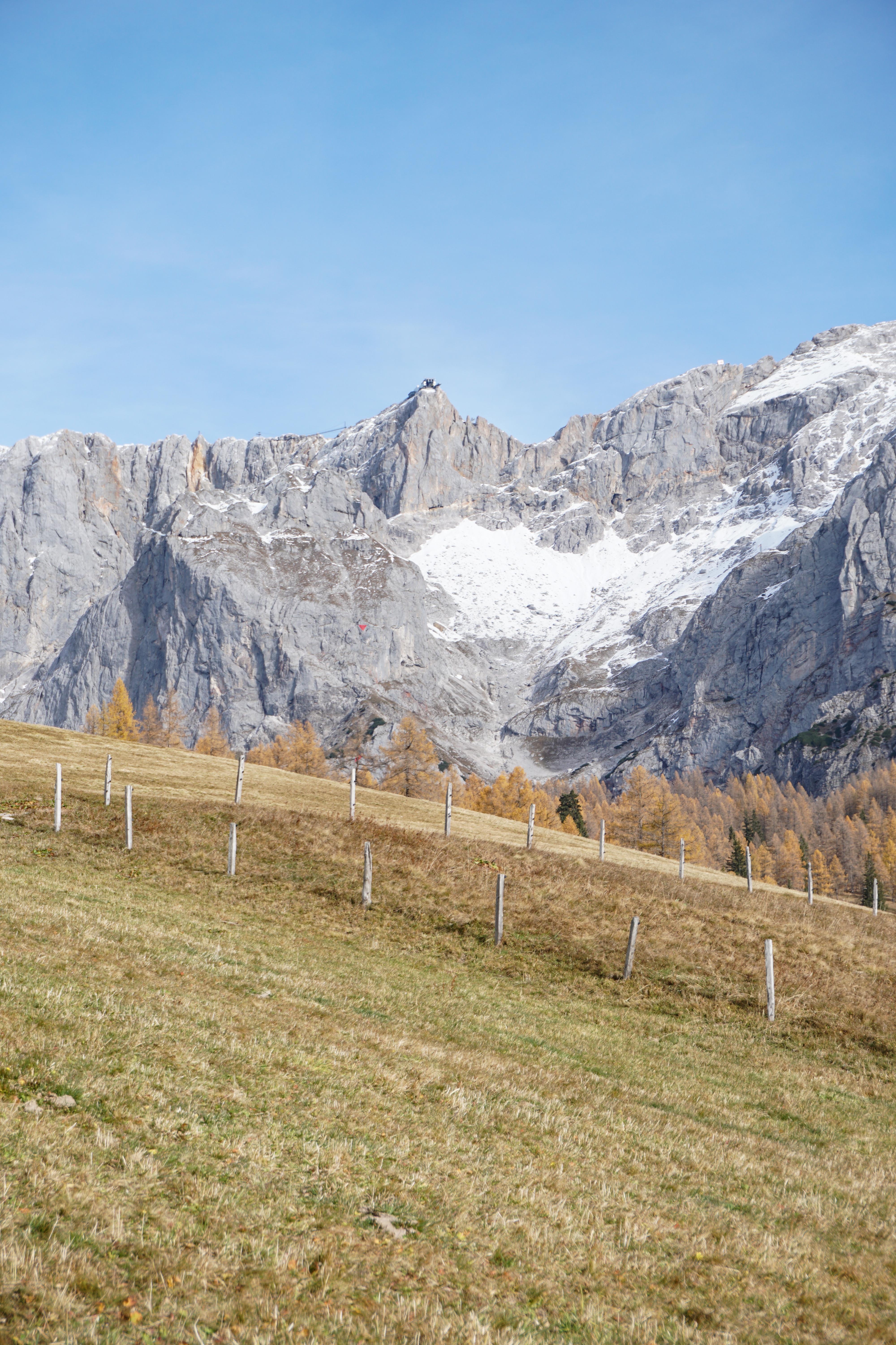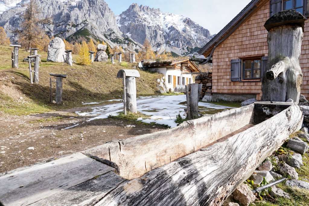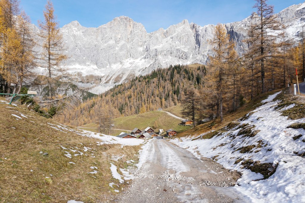 Nachdem ich die Dachsteinstraße überquert habe, erreiche ich mit der Glösalm die erste von 4 Almen. Ich wandere ein kleines Stück entlang des Wanderpfads weiter nach oben. Ein kurzer Abstecher für ein Foto auf die Neustattalmen muss nämlich auch noch drinnen sein.