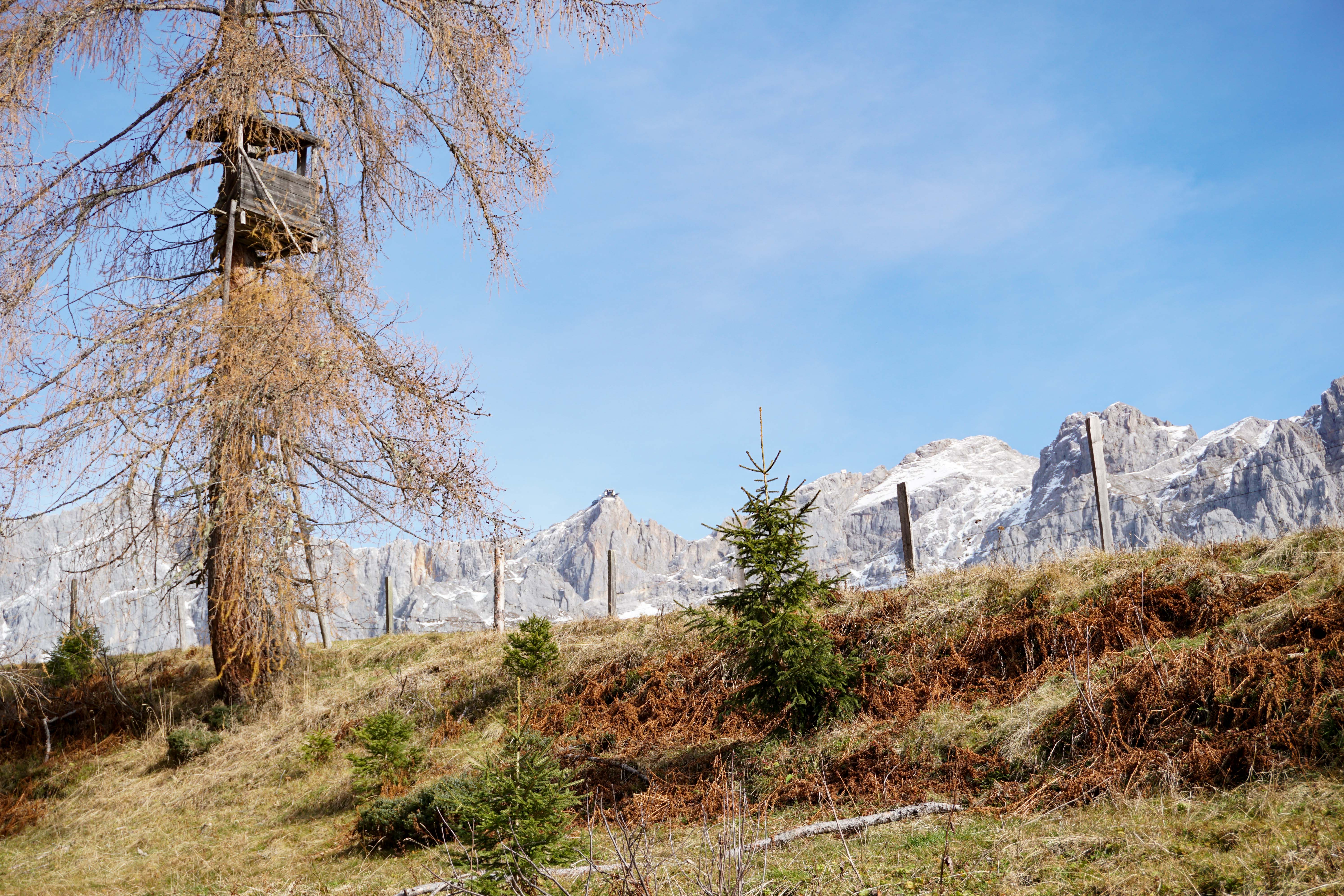 Vom Richlegghof in Filzmoos fahre ich mit dem Auto nach Ramsau, wo ich beim Gasthof Edelbrunn starte und wandere von dort in Richtung Glösalm. Ein breiter Wanderweg führt mich zuerst durch den Wald. Nach einer guten halben Stunde komme ich aus dem Wald heraus und vor mir eröffnet sich ein traumhaft schönes Panorama.
