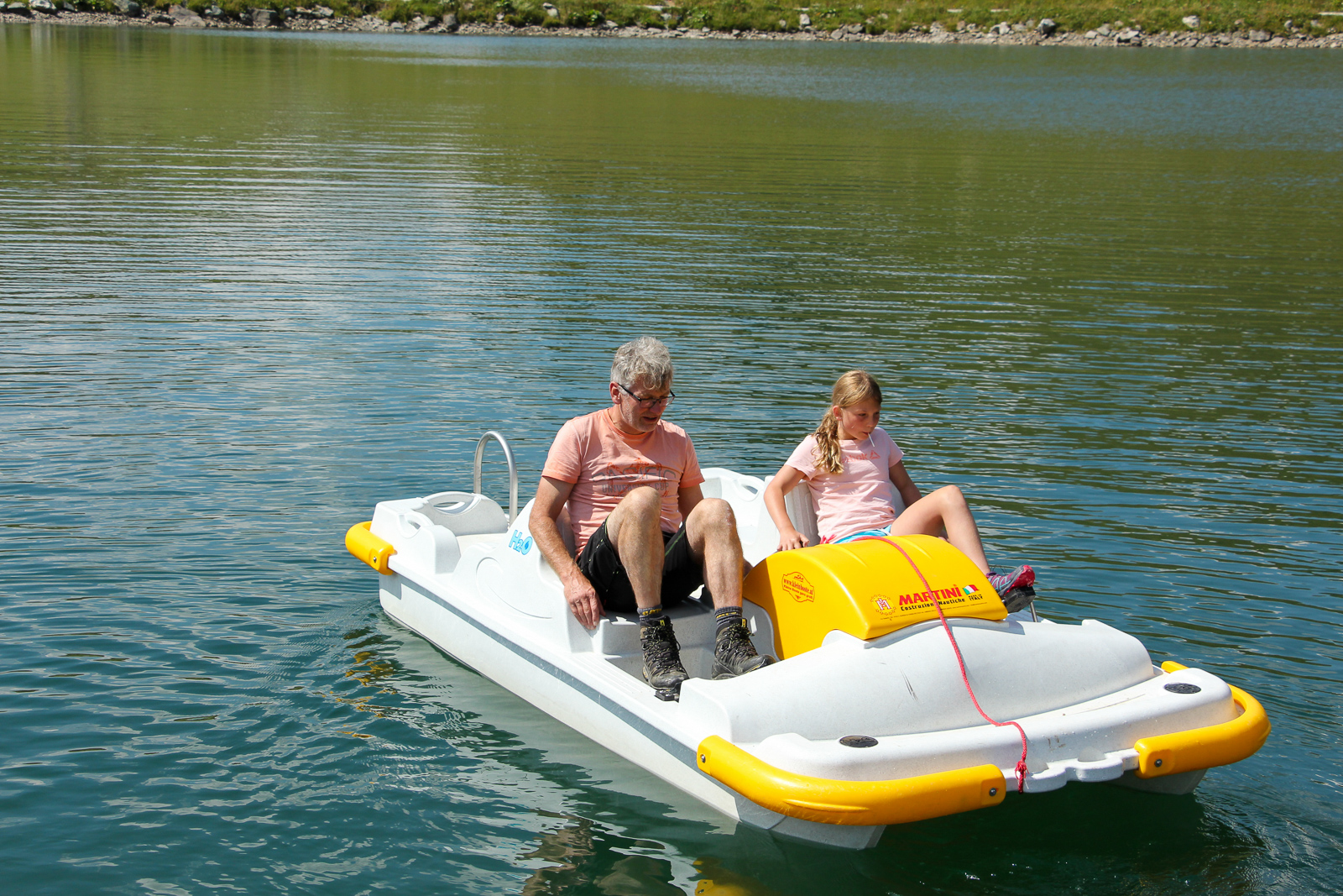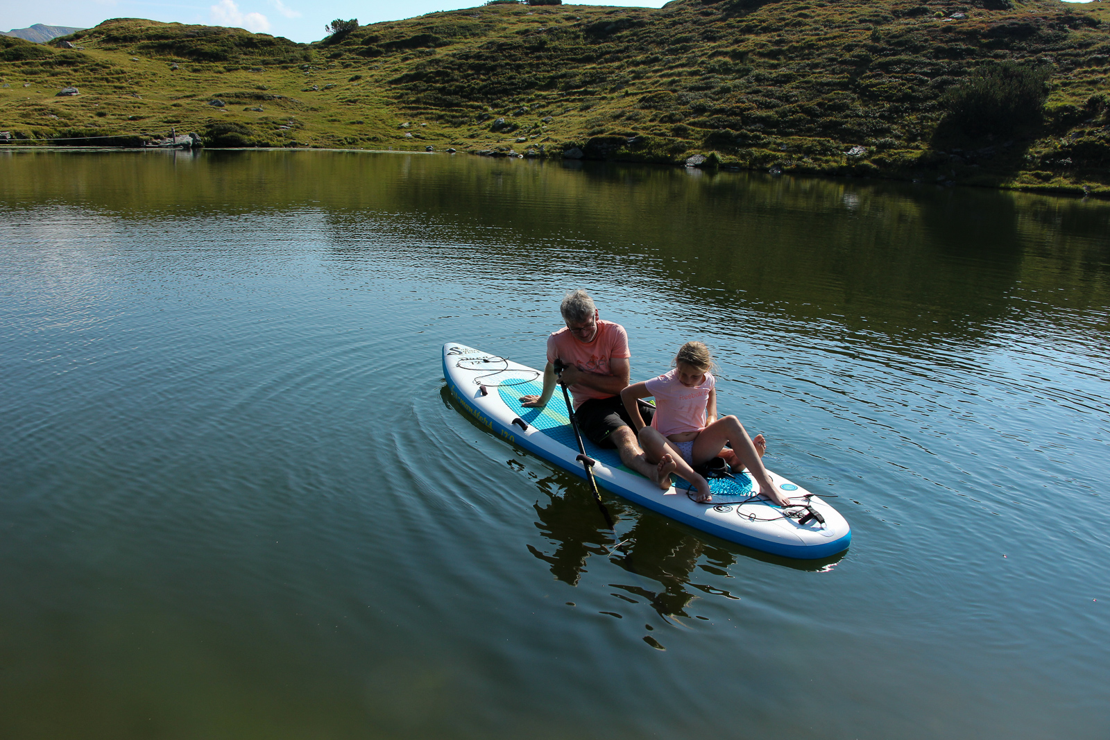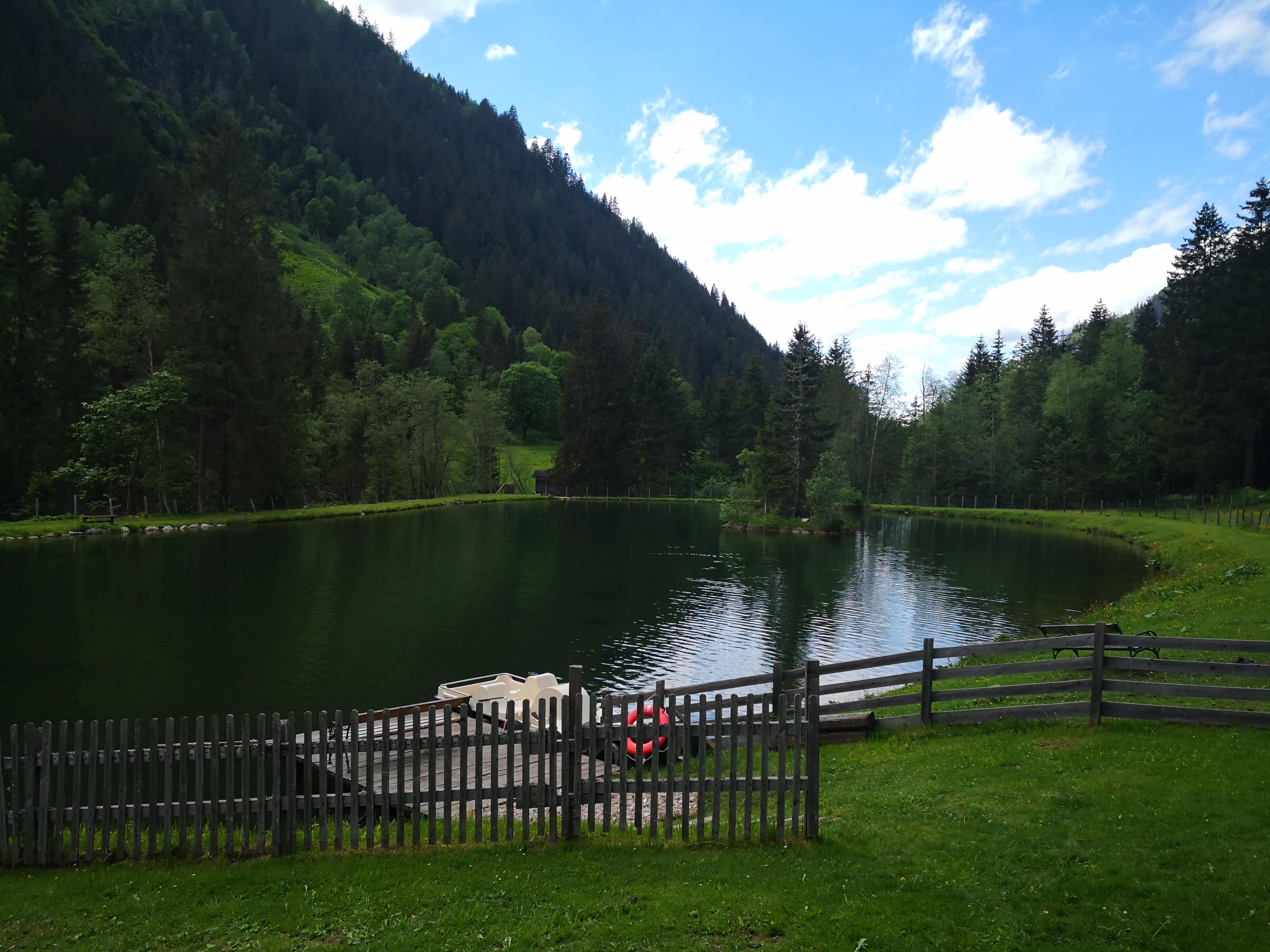 Wir kehren auf ein Getränk in die Fahrlechhütte, direkt am See ein, bevor wir eine Runde um den See in Angriff nehmen. Die Kids lassen sich von den kalten Temperaturen des Sees nicht abhalten, eh wir uns versehen, sind die beiden Mädels schon im Wasser, um sich zu erfrischen.