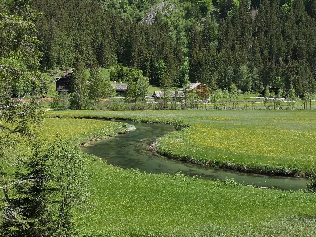 Idyllisch schlängelt sich der glasklare Untertalbach durch die Landschaft des Untertals in Rohrmoos. Ruhig und fast ein bisschen sanft, noch keine Spur vom „wilden Wasser“. Vom Parkplatz nahe der Waldhäuslalm starten wir unsere gemütliche Tour, die landschaftlich wirklich unglaublich reizvoll ist. Grüne Weiden, Wiesenblumen in allen Farben – ein echter Naturgenuss.
