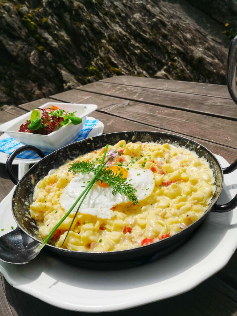 Schön langsam knurrt uns allen auch schon der Magen und wir begeben uns zur Duisitzkarseehütte. Den Naschkatzen unter uns haben es hier vor allem die leckeren Mehlspeisen angetan, ebenso wie die Buttermilch mit frischen Schwarzbeeren – die war auch echt lecker.